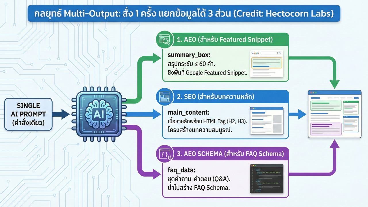 เมื่อคุณสามารถควบคุมให้ AI ส่งมอบ “ชิ้นส่วนข้อมูล” (Structured Data) ที่ถูกต้องได้ คุณก็สามารถสร้าง “โรงงานผลิตคอนเทนต์” ที่รองรับทั้ง SEO, AEO และ GEO ได้ในระดับสเกล โดยที่ยังรักษาคุณภาพของโครงสร้างเว็บไซต์ไว้ได้อย่างสมบูรณ์แบบครับ