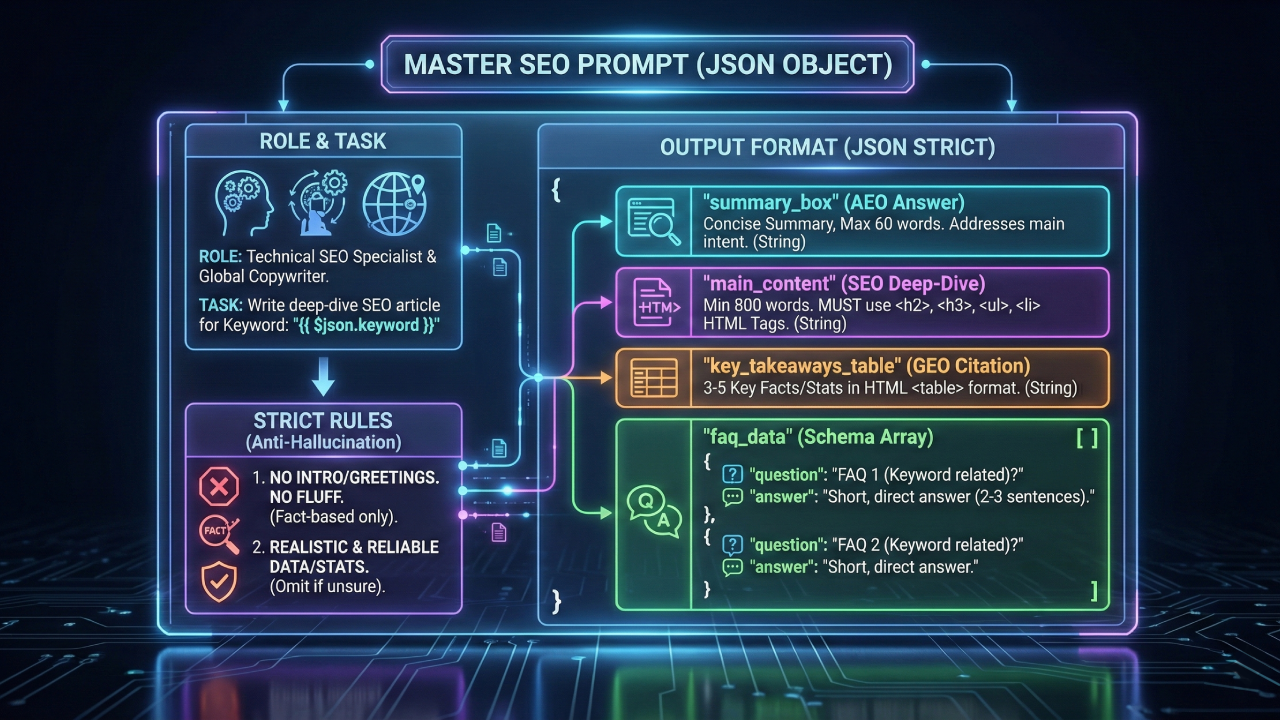 นี่คือ Master Prompt สั่ง AI สร้างเนื้อหาเจาะระบบ SEO, AEO และ GEO คุณสามารถคัดลอก Prompt นี้ไปปรับใช้ใน Node ของ Gemini (หรือ AI ตัวอื่นๆ) ใน n8n ได้ทันทีครับ ส่วนใครที่ยังไม่มี n8n สามารถเข้าไปอ่าน คู่มือสอนสร้าง WordPress Automation ด้วย Gemini และ n8n