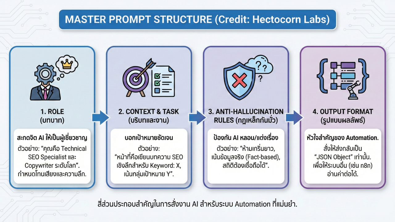 Anti-Hallucination Rules (กฎเหล็กกันมั่ว): นี่คือส่วนที่สำคัญที่สุดในการป้องกัน AI “หลอน” หรือแต่งเรื่องเอง คุณต้องใส่ข้อห้ามที่ชัดเจน เช่น “ห้ามเกริ่นนำยืดยาว, เน้นเฉพาะข้อมูลที่เป็นข้อเท็จจริง (Fact-based), ข้อมูลสถิติต้องเชื่อถือได้”