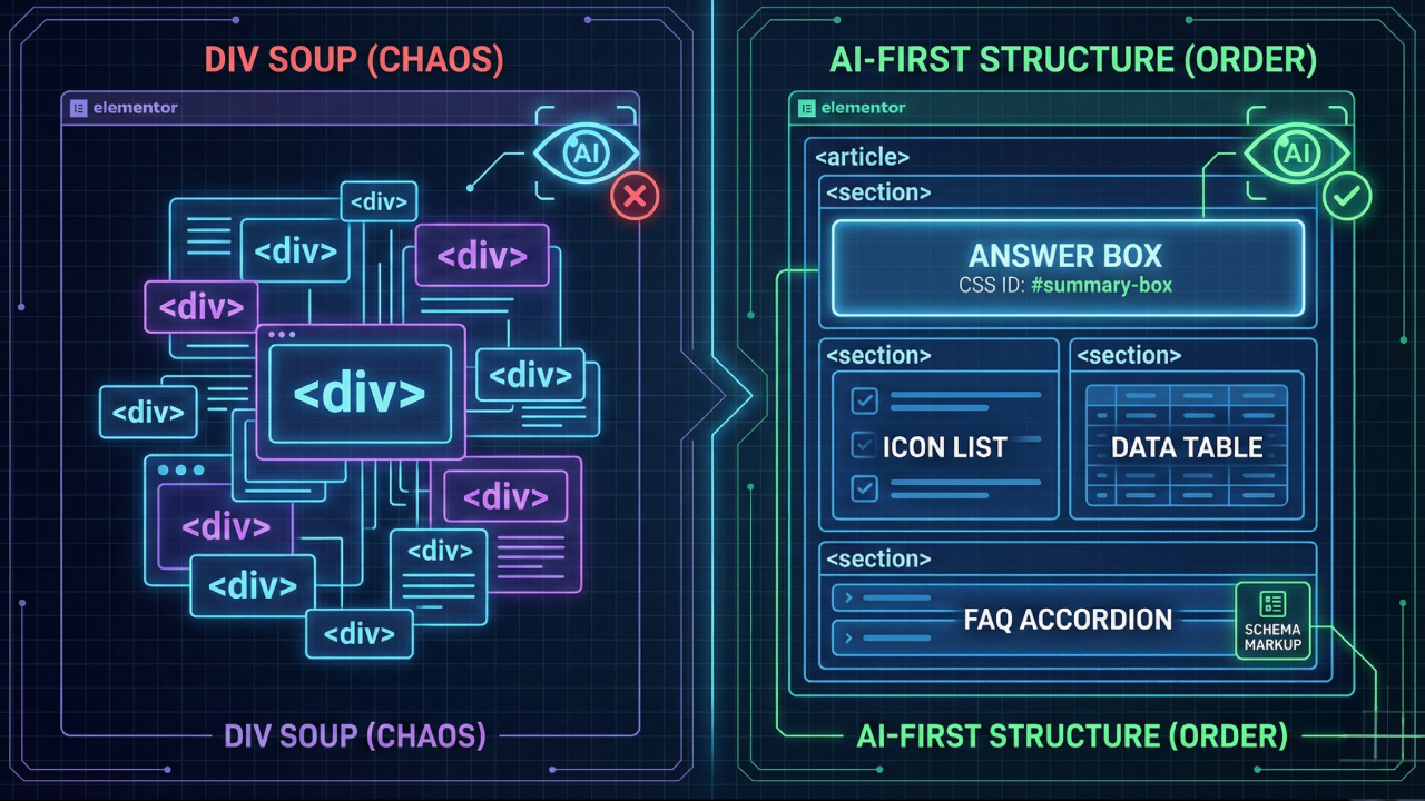 การใช้ Elementor มักเจอปัญหาโค้ดรก (Div Soup) นี่คือวิธีจัดระเบียบใหม่เพื่อให้ AI เข้าใจโครงสร้างเว็บคุณ: